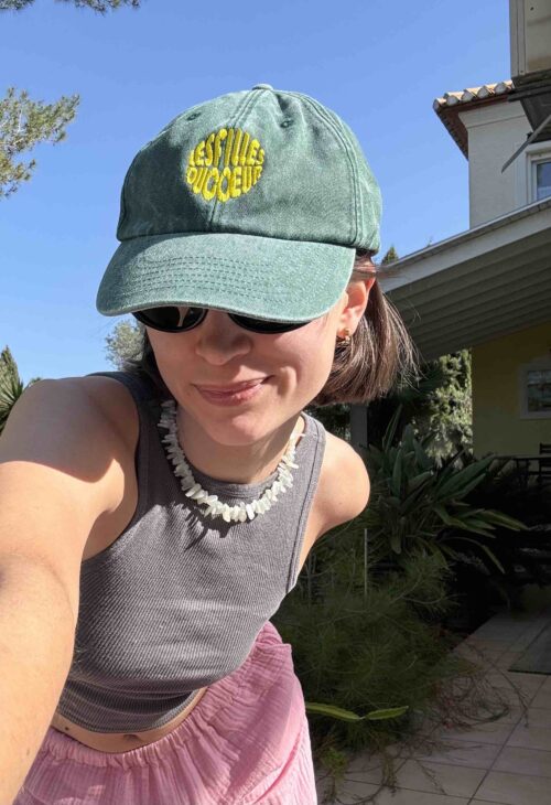 Embroidered cotton cap in the color “olive” with embroidery in pink and with size-adjustable closure