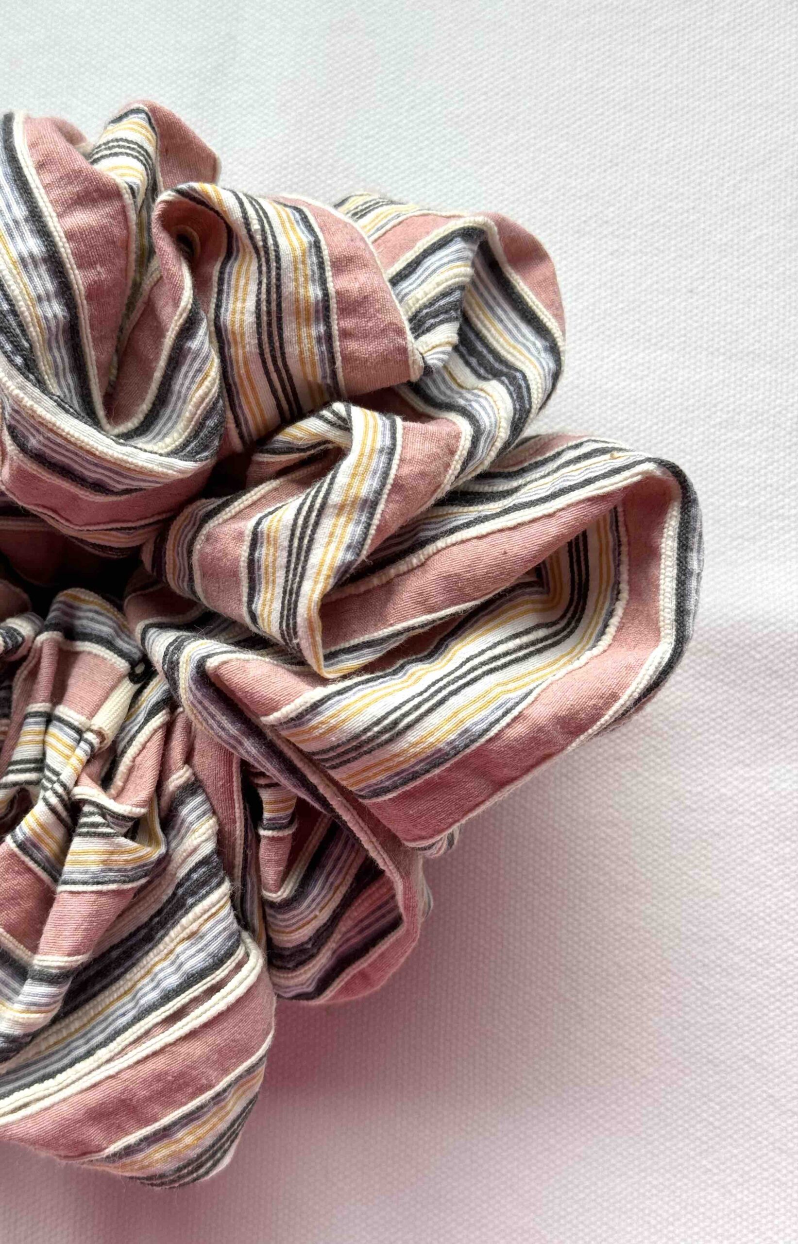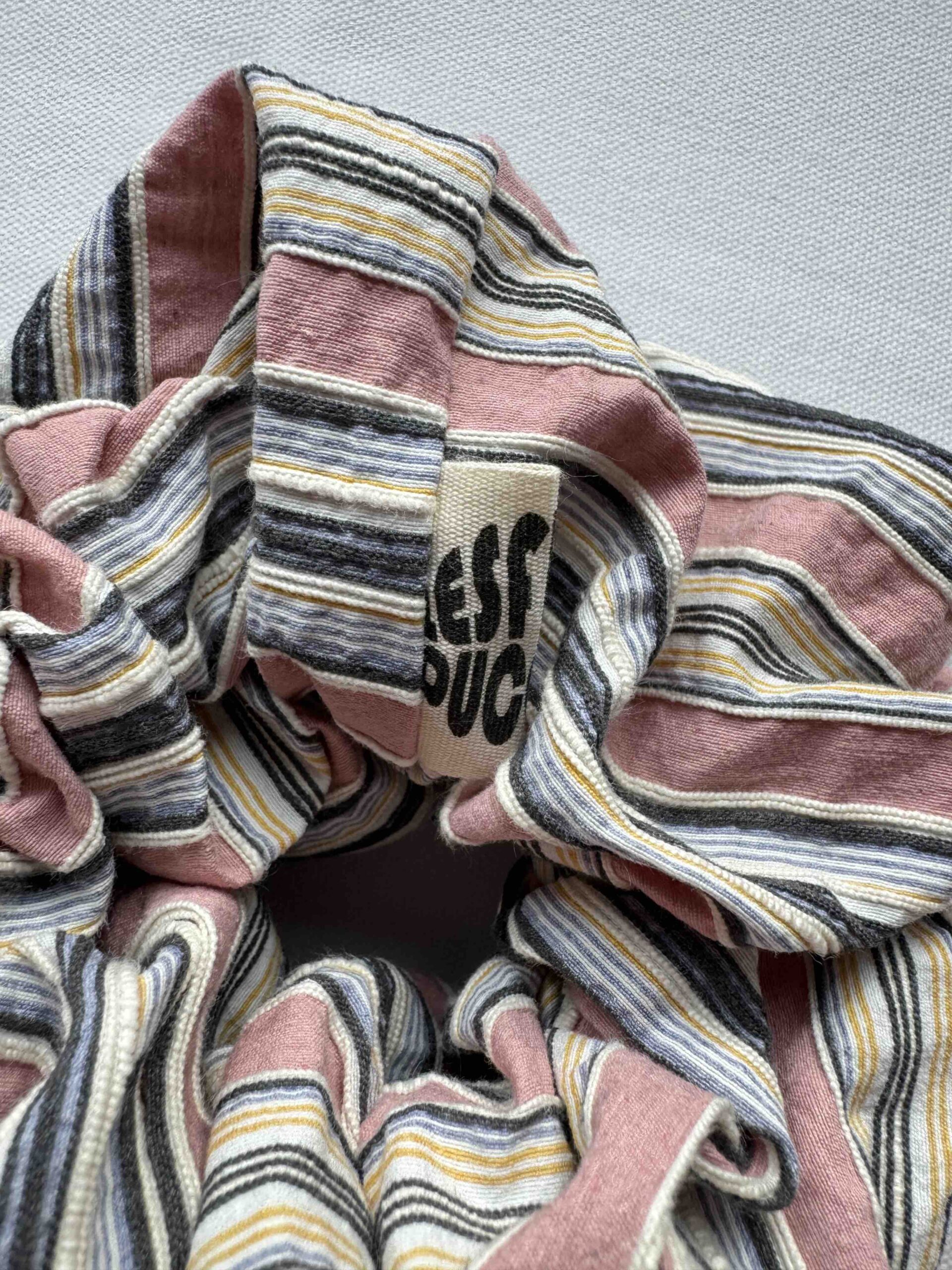 Our handmade scrunchie “Thilda” for an extravagant look in the hair and on the wrist is made of a cotton mix with 40% polyester – this gives it a special stand and hold for your hair. The extraordinary size can be seen from the pictures.