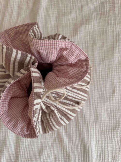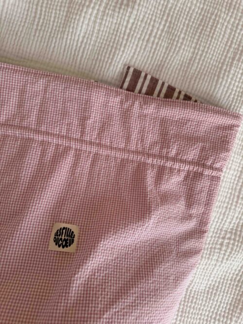Embroidered cotton zip bag in pink with brown ‘Hot People Knit’ embroidery and ‘LESFILLESDUCOEUR’ lettering on the back – perfect for storing smaller knitting projects like hats or scarves.