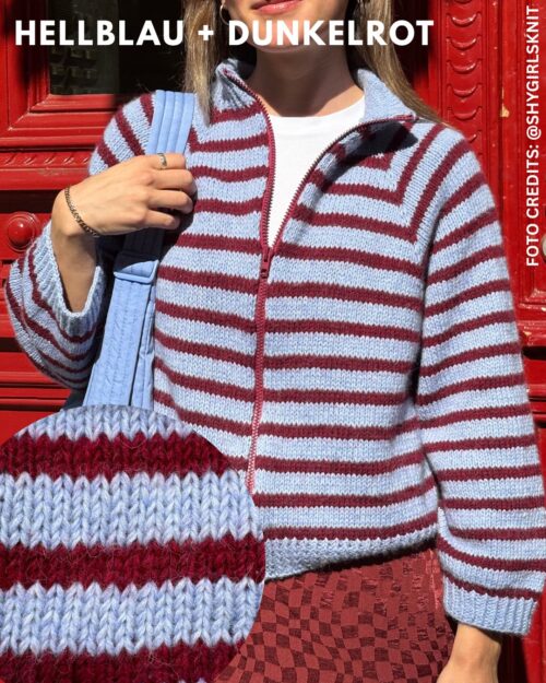 unterschiedlichen Farbschattierungen innerhalb eines Farbbads kommen kann. Um ein gleichmäßiges Farbbild beim Stricken zu erhalten, empfielt es sich mit jeweils 2 Stränge im Wechsel zu stricken.